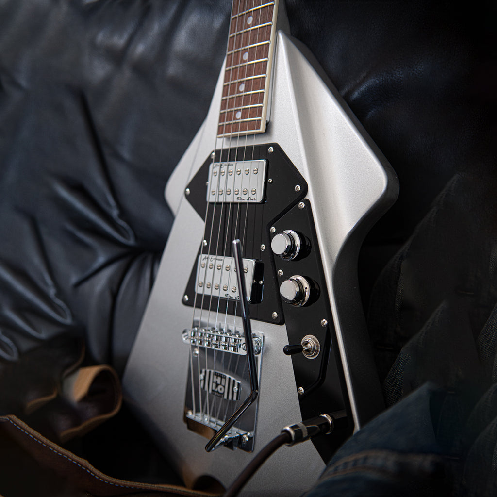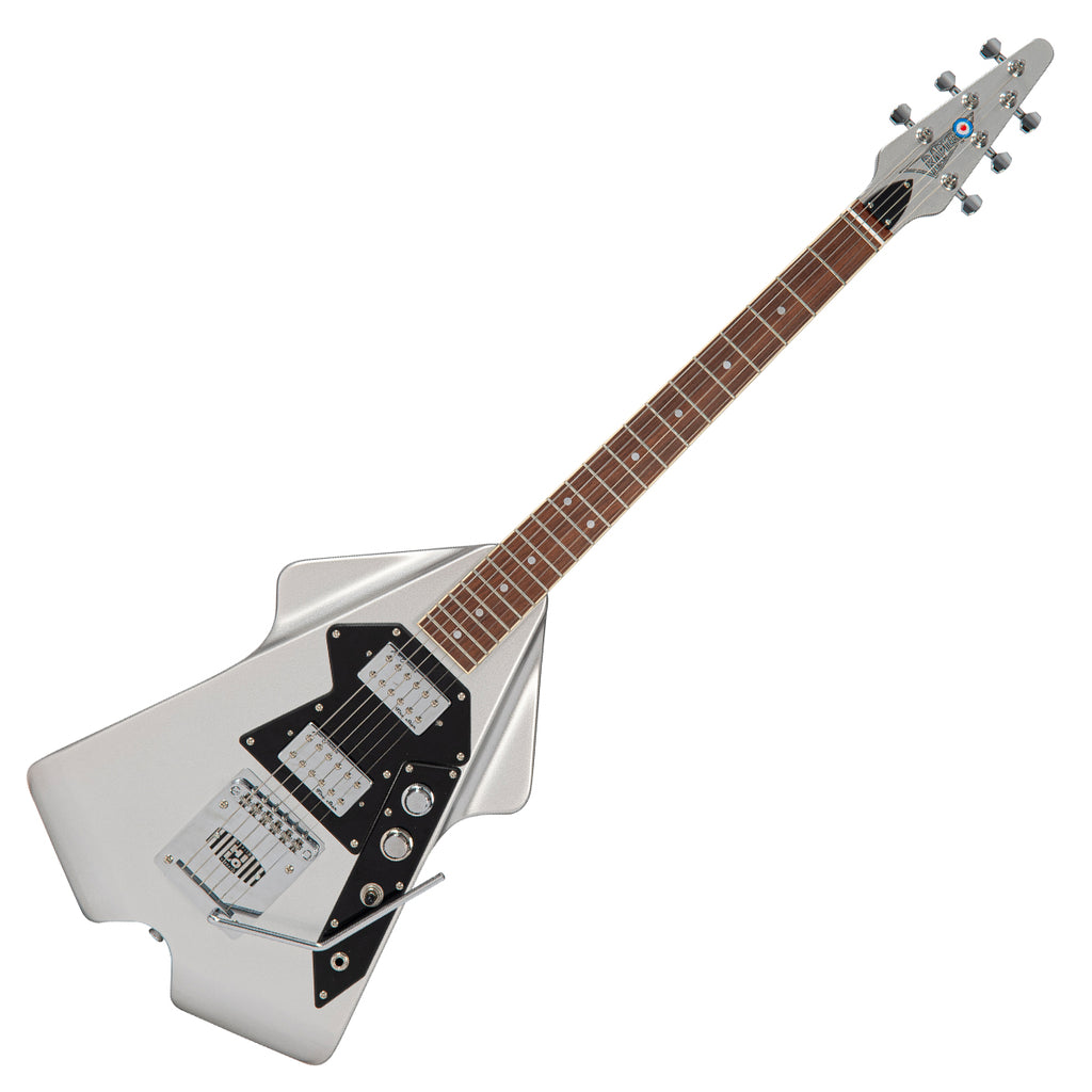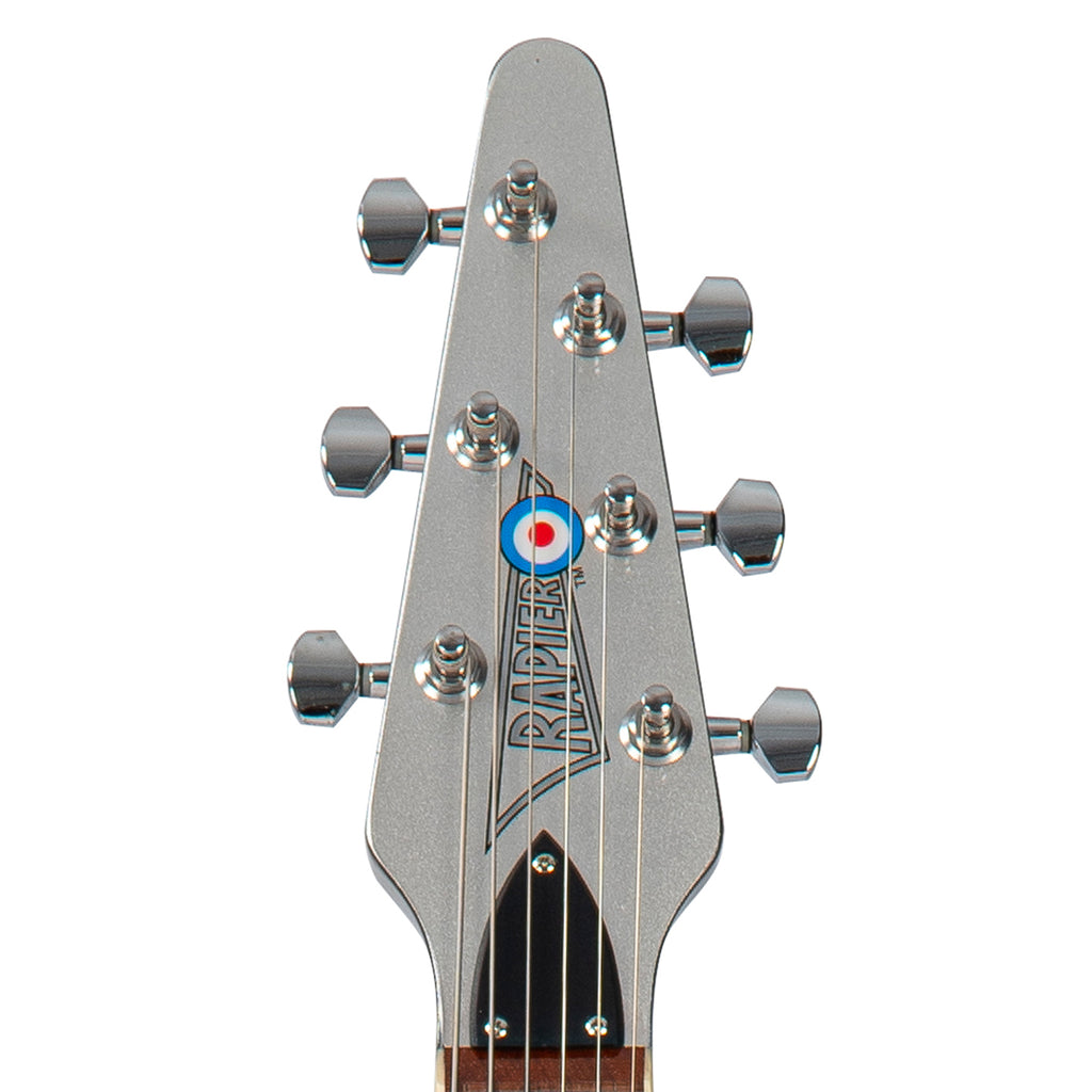 With its distinctive symmetrical, swept-wing okoume body, neck and angled headstock, all finished in a striking metallic silver, offset with a single ply black scratchplate and chrome hardware, the Rapier Rocket looks unquestionably cool.