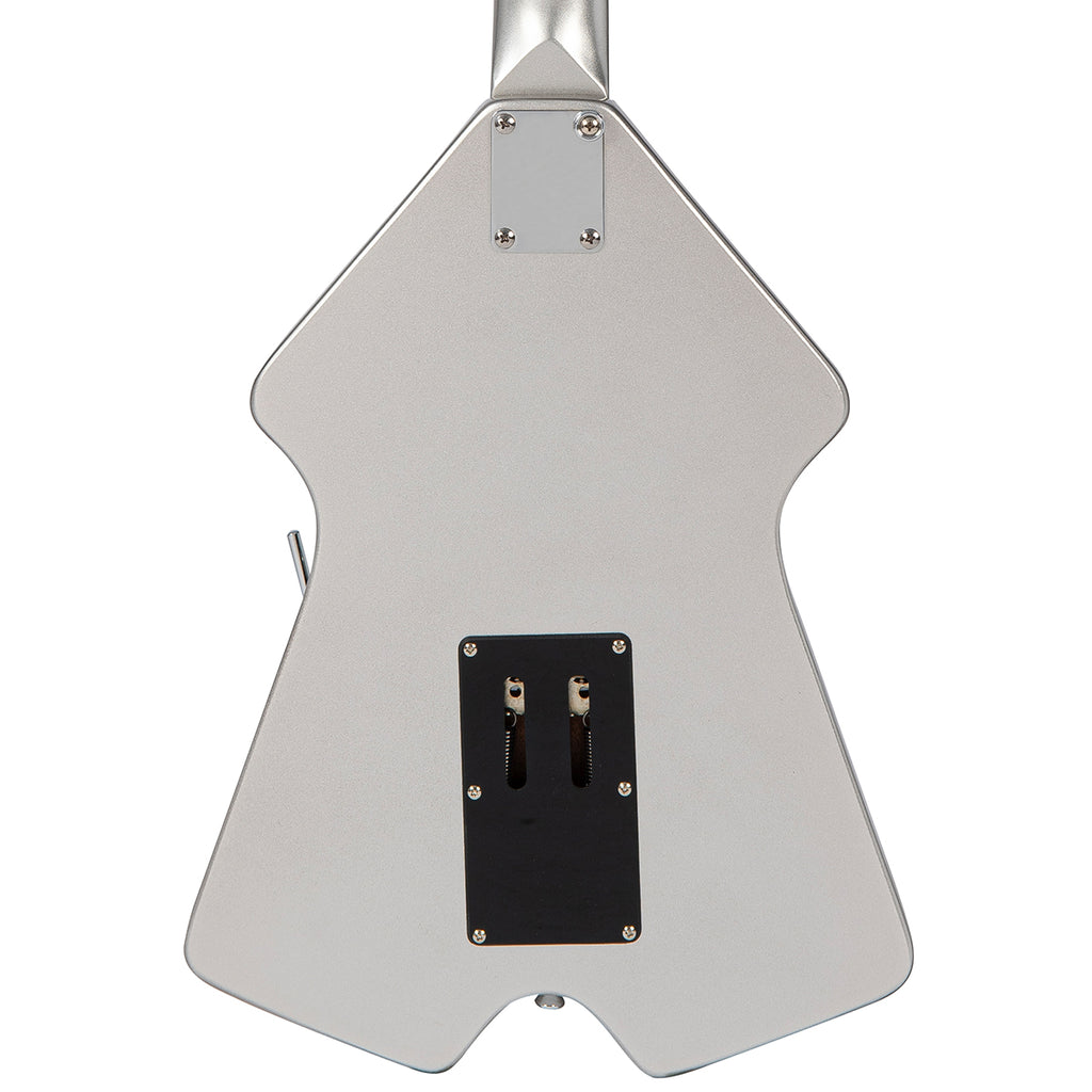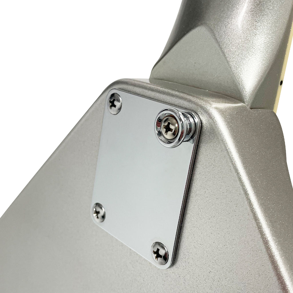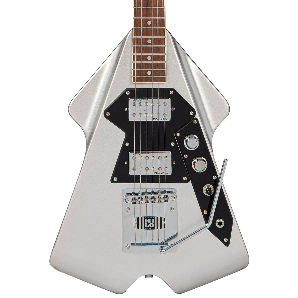 With its distinctive symmetrical, swept-wing okoume body, neck and angled headstock, all finished in a striking metallic silver, offset with a single ply black scratchplate and chrome hardware, the Rapier Rocket looks unquestionably cool.